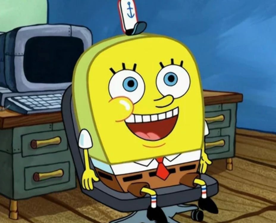 So what if I had a 40-year old work alter-ego, a worksona. She doesn’t represent the confident and daring Quinn, but she could be the normal SpongeBob of my life. I don’t need my job to see me for me while i’m trying to cultivate a life full of friends that see me, I just need my job to see my performance and output.